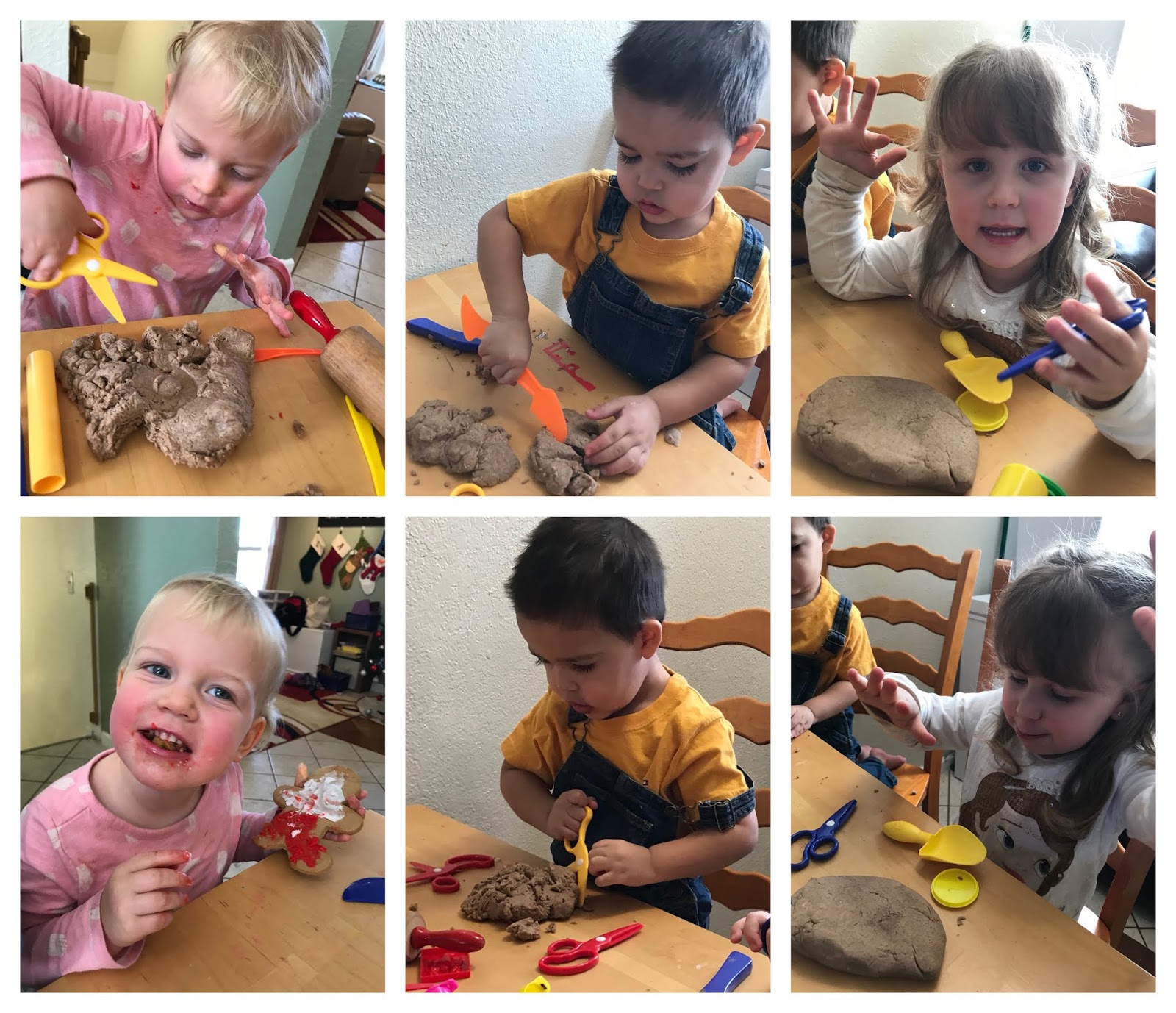Play dough ingredients:2 cups flour3/4 cup salt4 teaspoons cream of tartar2 cups lukewarm water2 Tablespoons of vegetable oil2 T. Cinnamon2 T. Ginger2 T. Cloves