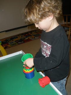We also explored the pattern blocks. "C" was busy making "Farms" for all the little play animals.